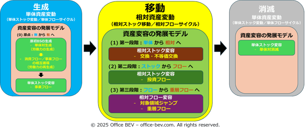 資産変動が起点となり展開される資産変容は、資産変動の発展モデルに従い、資産変容の発展モデルを形成する。